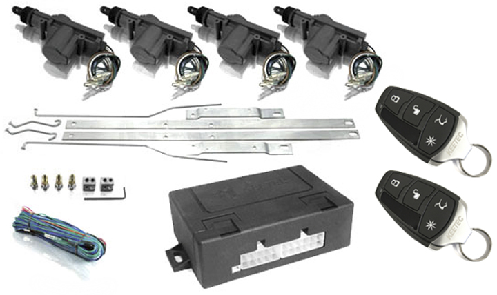 Centrálne zamykanie na diaľkové ovládanie pre 4-dvere - sada pre vozidlá ŠKODA FABIA, 4 ks päťvodičové servo, výstup na smerové svetlá, sada tiahel, spojovací materiál, kabeláž pre 4-dvere vozidla s vyvedením zadných kontaktov