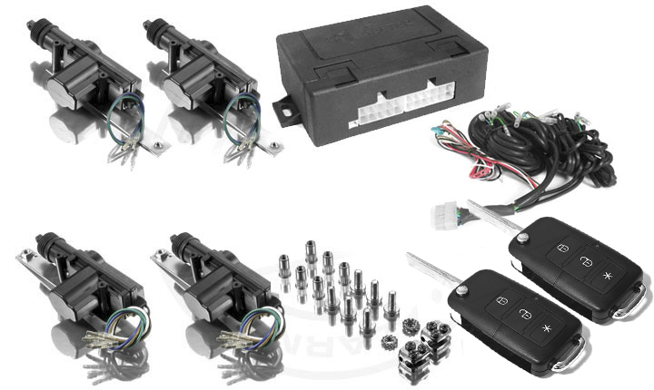 Centrálne zamykanie na diaľkové ovládanie pre 4-dvere - sada pre vozidlá ŠKODA FELICIA, 2 ks päťvodičové servo , 2 ks dvojvodičové servo, sada tiahel, spojovací materiál, kabeláž pre 4-dvere vozidla